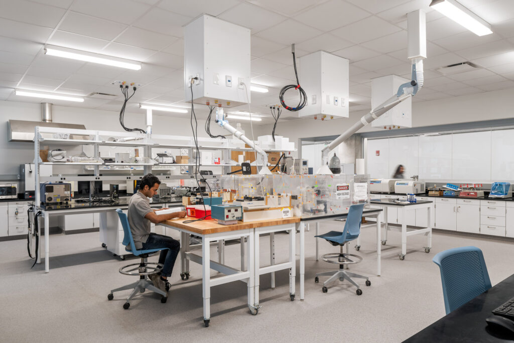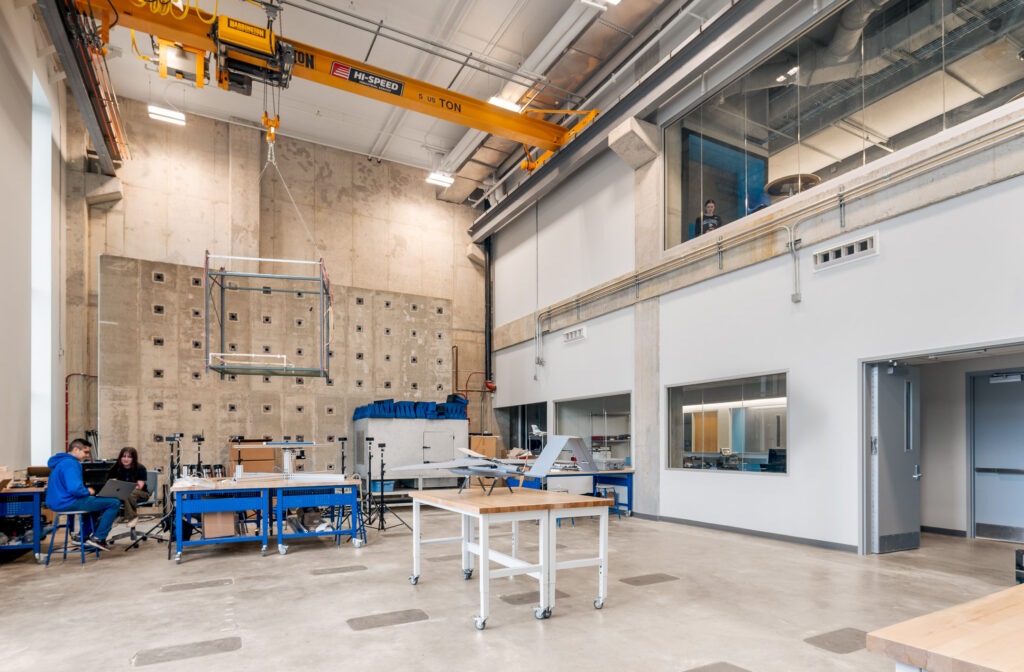 - Lab Flexibility: High-bay laboratories and fabrication shops on the ground floor are designed with oversized openings to accommodate large machinery and evolving research needs.